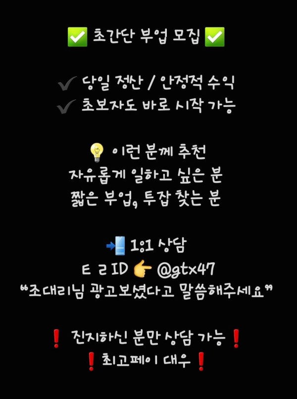 갤러리 본문 영역 ❗❗❗정말 간절하신분 성실하신분 돈 급하신분 모두 오세요❗❗❗앱에서 작성 ㅇㅇ 25-07-02 23:22 조회 502 댓글 0 다음글 지금 시작 가능한 초간단 부업 !!주부 / 직장인 누구나 가능 !!당일 정산 !! / 안정적인 수익 !! 초보자도 쉽게! 복잡한 절차 없음이런 분께 딱 맞아요 !!부수입이 필요한 분 !!시간 자유롭게 일하고 싶은 분 !!일하기 시작하면 돈걱정은 안하셔도 됩니다 !!1:1 상담문의ㅌㄹ ID ? @gtx47"조대리님" 광고보셨다고 말씀해주세요(간보시는분들 상담불가)